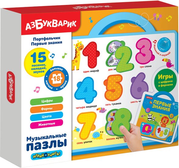 | Информация | С таким портфельчиком дошкольник поскорей захочет пойти в первый класс! Портфельчик стильный, яркий, из легкого материала EVA, а самое главное – в нем есть все необходимые знания. Вставляя мягкие фигурки в нужные окошки, малыш будет учить цифры, формы и цвета, познакомится со зверюшками. Родители могут поиграть вместе с ребенком в обучающие игры: считалочка, угадайка «Формы и цвета» и т.д. Такие занятия развивают память, логическое мышление, мелкую моторику. Фигурки разной формы можно использовать как трафареты при рисовании, что способствует развитию творческого воображения. А обучающие песенки про цифры, формы, цвета и веселые мелодии помогут закрепить новые знания. |