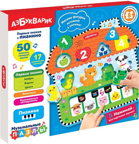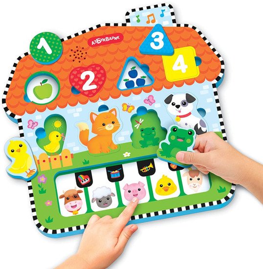 | Информация | ? Уникальная развивающая игрушка 3 в 1: пазл-вкладыш + музыкальный планшетик + пианино! Изготовлена из легкого мягкого материала EVA, с которым удобно и приятно играть. ? Доставая и вставляя мягкие фигурки в нужные окошки, малыш познакомится со зверюшками, выучит цифры и формы. Все картинки — говорящие и музыкальные. ? Нажимая на них, ребенок запомнит голоса животных, звуки музыкальных инструментов, послушает песенки про зверят и веселые мелодии. ? Режим «Волшебное пианино» позволит малышу почувствовать себя настоящим музыкантом и сыграть на пианино 8 популярных мелодий. ?? Батарейки в комплект не входят. |