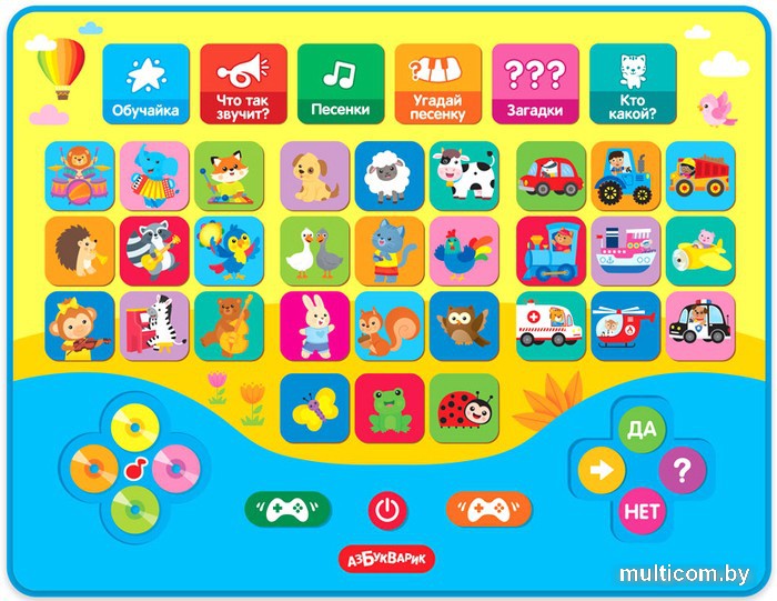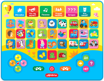 | Информация | Ваш малыш хочет много знать? Тогда этот новый игровой планшетик – для него! В нем собрано 30 познавательных песенок про животных, машинки и музыкальные инструменты, 150 вопросов и загадок, множество голосов и звуков! Выбери игру и попробуй ответить правильно на все вопросы! Всего в планшетике 8 игровых режимов: «Обучайка», «Что так звучит», «Песенки», «Угадай песенку», «Кто какой?», «Загадки», «Верю – не верю» и «Суперигра». Умные игры можно чередовать с прослушиванием песенок – так играть гораздо веселее! |