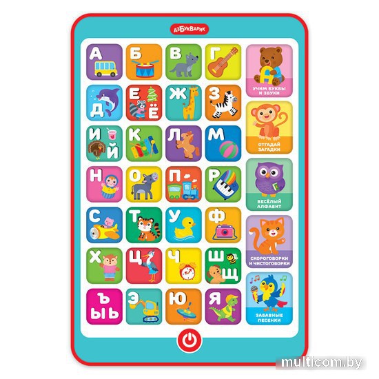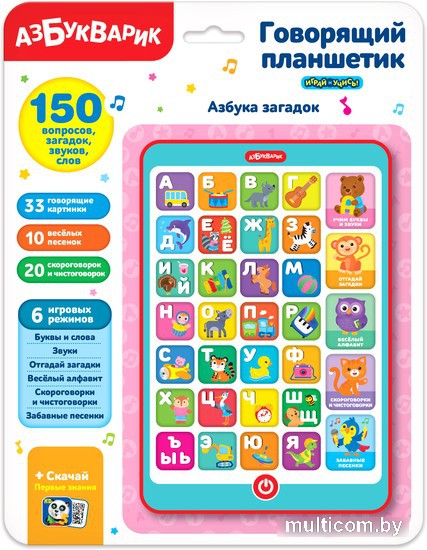 | Информация | Компактный игровой планшетик «Азбука загадок» прекрасно подойдет для всестороннего развития ребенка! В нем собрано целых 6 игровых режимов: буквы и слова, звуки, загадки, весёлый алфавит, чистоговорки, песенки. А еще 150 вопросов, загадок, звуков и слов. Нажимая на кнопочки, малыш выучит буквы и запомнит, как они звучат. Игра «Веселый алфавит» поможет ему проверить знания, а 20 скороговорок и чистоговорок – улучшить произношение звуков. Также в планшетике собрано 30 умных загадок. Во время игры можно сделать музыкальную паузу – и послушать 10 веселых песенок («Песенка про алфавит», «Игрушки», «Лето», «Все зверята любят петь», «Пляшут весело детишки», «Зарядка», «Что такое праздник?», «Стало солнышко теплей», «Питомцы», «Мама-мамочка»). Каждая из 33 картинок планшета с алфавитом звучит! Эта музыкальная игрушка способствует развитию памяти, внимания, формирует интеллект. |