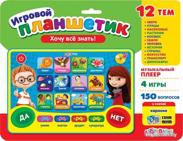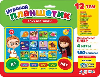 | Информация | 12 тем, 150 вопросов и заданий, мини-плеер ("Полька", "Чунга-чанга", "Если нравится тебе, то делай так") и 4 игры ("Умник", "Знаток", "Эрудит" и "Суперигра") ждут маленьких эрудитов в этом планшетике. |