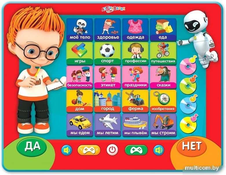 | Информация | Этот говорящий планшетик – прекрасный подарок для маленьких эрудитов! 200 умных вопросов, 20 игровых тем, 3 уровня – играй и узнавай много интересного! Выбирай одну из увлекательных викторин – «Марафон» или «Фортуна». Отвечай на вопросы с весёлым Максом и становись Суперзнатоком! А мини-плеер с любимыми песенками («Песенка друзей», «Пусть бегут неуклюже», «Улыбка», «Танец маленьких утят») поднимет настроение! |