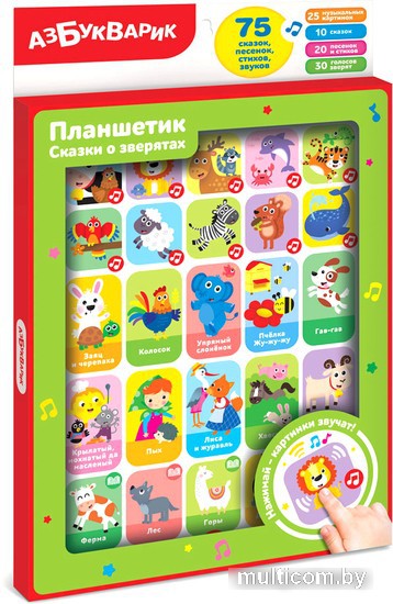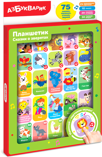 | Информация | В этом планшетике собрано всё о зверятах: и весёлые песенки («Африка», «Лесные соседи», «Море, море, море!», «Джунгли» и др.), и сказки о животных («Заяц и черепаха», «Колосок», «Упрямый слонёнок», «Гав-гав», «Хвосты» и др.), и познавательные стихотворения («Телёнок», «Не ходите далеко», «Волк», «Мишка-трусишка» и др.). Сказочные истории о зверятах так интересно слушать, а песенки или стихи легко выучить наизусть. Всего в планшетике 30 песенок, сказок, стихов, а еще множество звуков и голосов зверят. Все картинки звучат! |
