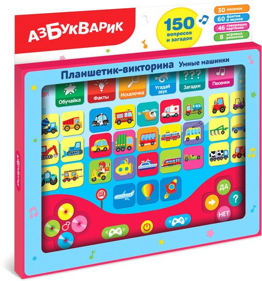 | Информация | Ваш малыш хочет знать все о машинах? Тогда этот новый игровой планшетик – для него! В нем собрано 30 интересных фактов о машинах, 30 познавательных песенок, 150 вопросов и загадок, множество интересных звуков! Выбери игру и попробуй ответить правильно на все вопросы! Всего в планшетике 8 игровых режимов: «Обучайка», «Факты», «Искалочка», «Угадай звук», «Загадки», «Песенки», «Умняшка» и «Суперигра». Умные игры можно чередовать с прослушиванием песенок и мелодий – так играть гораздо веселее! |