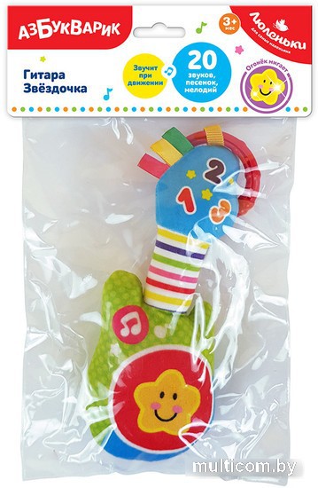 | Информация | ? Мягкая музыкальная игрушка-гитара подарит малышу много радости. Гитара звучит при движении и воспроизводит популярные песенки и мелодии с забавными звуками. Звездочка на гитаре светится и привлекает внимание малыша, помогая ему научиться фокусировать взгляд. Яркие атласные ленточки приятно трогать пальчиками. Игрушка подходит для малышей от трех месяцев и развивает слуховое, зрительное и тактильное восприятие. ?? Яркое колечко позволяет подвесить гитару на коляску или кроватку. Музыкальный модуль надежно спрятан в кармашке на липучке внутри игрушки. При необходимости игрушку можно стирать. ?? Батарейки в комплект не входят. |