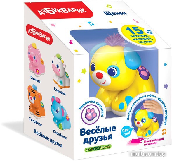 | Информация | Озорной щенок с пушистым чубчиком приведет малыша в восторг. А чубчик у него – волшебный! Нужно просто его погладить – и щенок заговорит! Нажимая на кнопочку, малыш послушает веселые песенки и мелодии («Я щенок забавный», «Питомцы», «Пляшут весело детишки», «Собачий вальс», «Чуку-чу»). А если погладить чубчик во время звучания – щенок будет подпевать. В игрушке также есть инерционный механизм – зверюшка ездит не хуже машинки. Соберите всю серию «Веселые друзья»: коровку, свинку, щенка, слоненка и тигренка. Получится настоящая семья зверят с разноцветными чубчиками! В каждой игрушке – разные песенки и мелодии, игры будут еще веселее! Музыкальные зверята способствуют речевому развитию ребенка, формируют коммуникативные качества и музыкальные способности, а также развивают фантазию. «Веселые друзья» способствуют лучшей социальной адаптации вашего ребенка. |
