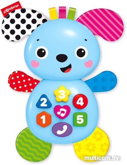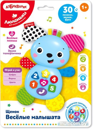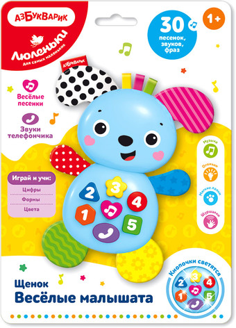 | Информация | Озорной щенок станет для малыша не просто любимой игрушкой, а хорошим другом! Нажимая на кнопочки, ребенок сможет послушать 30 звуков, фразочек, песенок («Как чудесно жить на свете», «Что такое праздник?», «Как хорошо все цифры знать», «Это что за чудеса?», «Быстро выучим цвета», «Пляшут весело детишки»), выучить цифры, формы и цвета, поиграть в телефончик. Огоньки на кнопочках мигают под музыку и создают ощущение праздника. А еще у щенка мягкие лапки и шуршащие ушки, которые так приятно трогать! Игрушка отлично подходит для развития слухового восприятия, музыкальных способностей и тактильных ощущений. Играй, учись и веселись! |