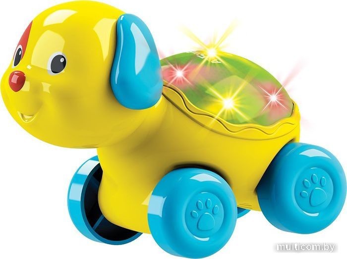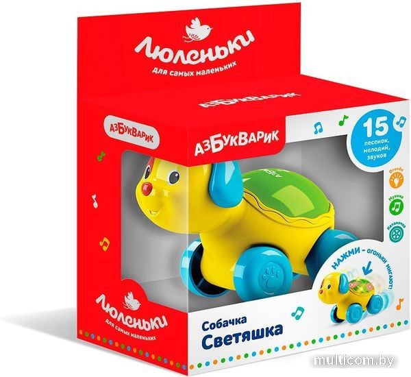 | Информация | Эту милую собачку не просто так зовут Светяшкой! Она вся светится разноцветными огоньками — малышу нужно только нажать ладошкой на спинку игрушки. Собачка Светяшка — музыкальная: она поет 6 веселых песенок и мелодий («Песенка про ферму», «Стало солнышко теплей», «Топ-топ, топотушки», «Веселая карусель» «Немецкая полька», «Чижик-пыжик»). А еще у собачки есть колесики, и ребенок сможет покатать ее. |