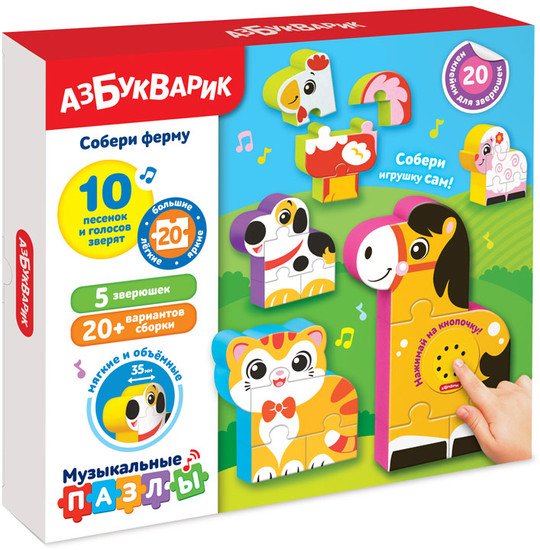 | Информация | Мозаика/пазл Азбукварик Собери ферму 2939 - это настоящие 3D-пазлы, специально разработанные для малышей. Они имеют крупные и мягкие детали, а также оснащены музыкальной кнопочкой и наклейками. В игровом наборе включено 20 деталей, которые позволят ребенку самостоятельно создать 5 уникальных игрушек-зверюшек: щенка, лошадку, петушка, котенка и овечку. Приклеивая наклейки из набора на детали, можно создать двусторонние игрушки, которые станут идеальным материалом для различных сюжетных игр. А благодаря музыкальной кнопочке, игра с ними станет еще интереснее. Нажимая на кнопку, малыш сможет послушать 5 веселых песенок о зверятах. 3D-пазлы изготовлены из мягкого материала EVA, который приятен на ощупь и удобен для игры. Крупные и яркие детали легко соединяются и разъединяются, что позволяет малышу самостоятельно справляться с этой задачей. Игра с 3D-пазлами развивает у малыша пространственное мышление, логику, конструкторские способности и мелкую моторику. Кроме того, она стимулирует фантазию, поскольку ребенок может придумывать и собирать своих собственных фантастических зверят из различных деталей. Если вы соберете всю серию, вашему малышу откроются еще больше возможностей для творчества. |