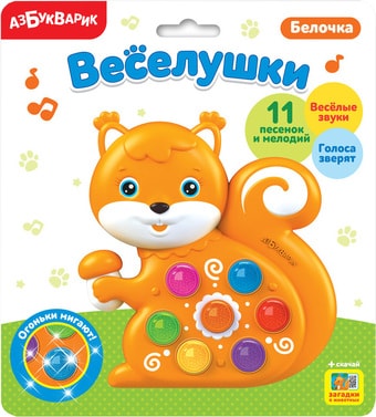 | Информация | Музыкальная игрушка Белочка из серии "Веселушки" подарит вашему малышу много веселья, порадует разноцветными мигающими огоньками и будет способствовать его гармоничному развитию. Нажимая на кнопочки, малыш сможет послушать добрые песенки и мелодии ("Сидит белка на тележке", "Танец зверят", "Белка", "В лесу так весело гулять", "Во саду ли, в огороде", "Белки-шалунишки" / "Кабы не было зимы", "Спи, моя радость, усни", танцевальные мелодии), весёлые звуки и даже голоса зверят!В игрушке используются элементы русского народного творчества - художественный образ Белочки, потешки, мелодии. Всё это разносторонне воздействует на малыша, учит образно мыслить, закладывает основы эстетической культуры.Играя с весёлой Белочкой, детки будут развивать мелкую моторику и координацию движений, музыкальный слух и чувство ритма, память и фантазию. |