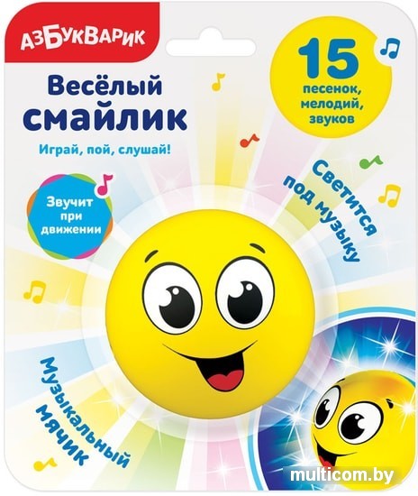 | Информация | Суперпопулярный образ смайлика – теперь в виде музыкальной игрушки для детей! Жизнерадостный улыбающийся колобок развеселит любого малыша! Он задорно смеется, поет песенки («Я весёлый мячик», «Чижик-пыжик»), проигрывает мелодии с множеством смешных звуков («По секрету всему свету», «Полька» и др.). Катай мячик – он звучит при движении и светится разноцветными огоньками. Игрушка легко включается и выключается с помощью тумблера. Выбери свой цвет смайлика: красный, желтый, голубой или зеленый! |