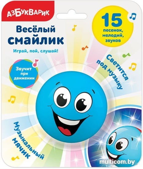 | Информация | Суперпопулярный образ смайлика – теперь в виде музыкальной игрушки для детей! Жизнерадостный улыбающийся колобок развеселит любого малыша! Он задорно смеется, поет песенки («Я весёлый мячик», «Чижик-пыжик»), проигрывает мелодии с множеством смешных звуков («По секрету всему свету», «Полька» и др.). Катай мячик – он звучит при движении и светится разноцветными огоньками. Игрушка легко включается и выключается с помощью тумблера. Выбери свой цвет смайлика: красный, желтый, голубой или зеленый! |