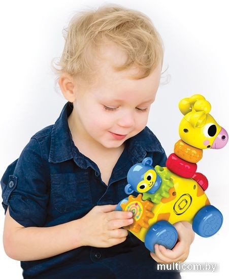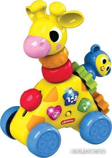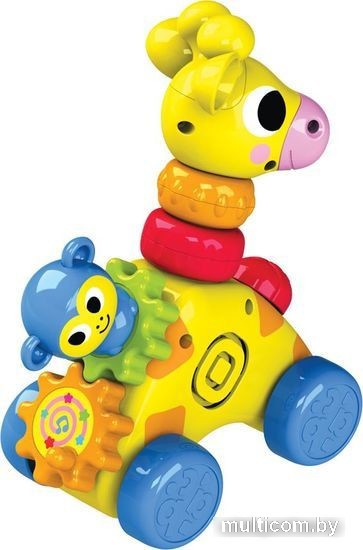 | Информация | Интерактивный Жирафик — уникальная многофункциональная игрушка: музыкальная каталочка со множеством подвижных элементов. Нажимая на яркие кнопочки, малыш послушает обучающие песенки (про счет, формы, цвета и противоположности), детские хиты и веселые мелодии. Во время звучания песенок на кнопочках мигают огоньки. И до чего же весело катать жирафика под музыку! Кроме того, в интерактивном жирафике много интересных деталей, которые помогут малышу в развитии мелкой моторики и тактильных ощущений. Жучок-трещотка издает забавный звук, шестеренки на спине можно вращать, голова у жирафика крутится, на шее — колесики с шариками, которые звенят, как погремушка. |