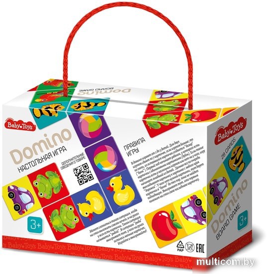 | Информация | Игра рассчитана на 2–5 игроков.Как играть?Для 2 игроков сдают по 7 карточек, для 3 и более – по 5. Оставшиеся карточки складываются в центр стола картинками вниз и образуют так называемый «базар» («банк»).Первый ход начинает ребёнок, у которого есть карточки с одинаковыми картинками («дубль»). Если такие карточки есть у нескольких игроков или же, напротив, их ни у кого нет – игру начинает самый младший игрок.Далее все по очереди выкладывают картинку к картинке с любого края «дорожки». Если у игрока, совершающего ход, нет нужной картинки – он берёт фишки из «банка» до тех пор, пока не выпадет подходящая.Выигрывает тот, кто первым выложит все свои карточки на стол.Игровые карточки изготовлены из плотного картона толщиной 3 мм, гладкие и приятные на ощупь. Яркие картинки изображают различные объекты в мультяшном стиле, благодаря чему игра принесёт ребёнку только положительные эмоции.Детское домино с картинками из серии игр для самых маленьких Baby Toys развивает логическое мышление, внимательность, образное мышление и усидчивость. |
