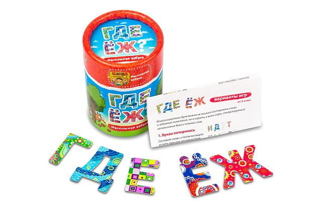 | Информация | Когда ребёнок учит буквы, полезно, чтоб они всегда были на виду и чтоб была возможность с ними взаимодействовать и играть. Оставить детям тайное послание на холодильнике, попросить их ответить — простая развивающая игра. Мы предлагаем несколько вариантов игр (загляните в раздел «Правила»), но вы можете придумать и свои!У каждой из букв магнитной азбуки «ГДЕ ЁЖ?» свой яркий орнамент — это очень нравится детям. Игра «Зверобуквы», откуда мы и взяли эти буковки, построена на принципе активного включения образной памяти. «ГДЕ ЁЖ?» и «Зверобуквы» будут отлично работать в тандеме, помогая ребёнку изучать буквы и составлять первые слова. |
