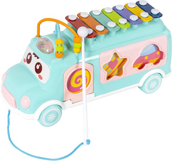 | Информация | Отлично подойдет для игры для малышам от 18 месяцев. Дверь автобуса открывается, имеет функции сортера и небольшие детали, что отлично подходит для развития мелкой моторики. Также автобус можно возить за веревочку. Таким образом, одна игрушка объединяет в себе несколько игровых функций: каталка, сортер, ксилофон. Игрушка поспособствует формированию тактильных ощущений, восприятия звуков, цветов, форм и поможет в развитии мелкой моторики и воображения Вашего малыша. |