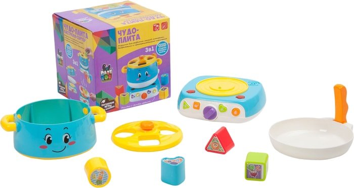 | Комплектация | Плита, кастрюля с крышкой-сортером, сковорода, 4 фигуры - круг, квадрат, треугольник, сердце разного цвета |