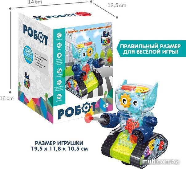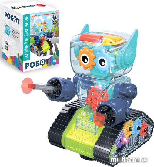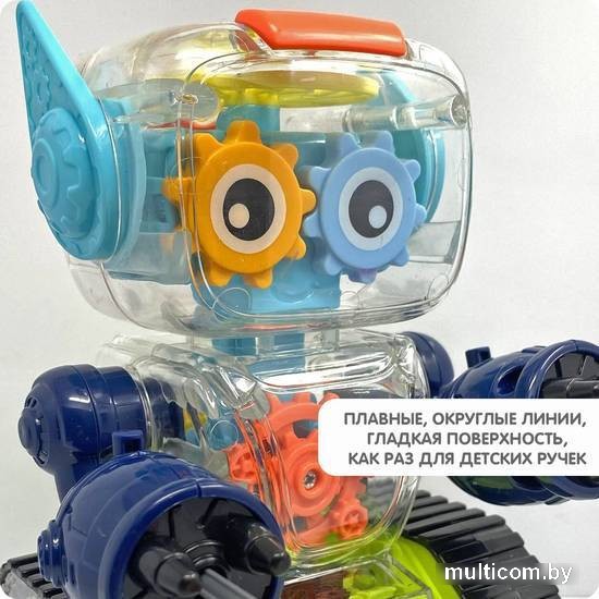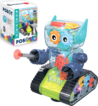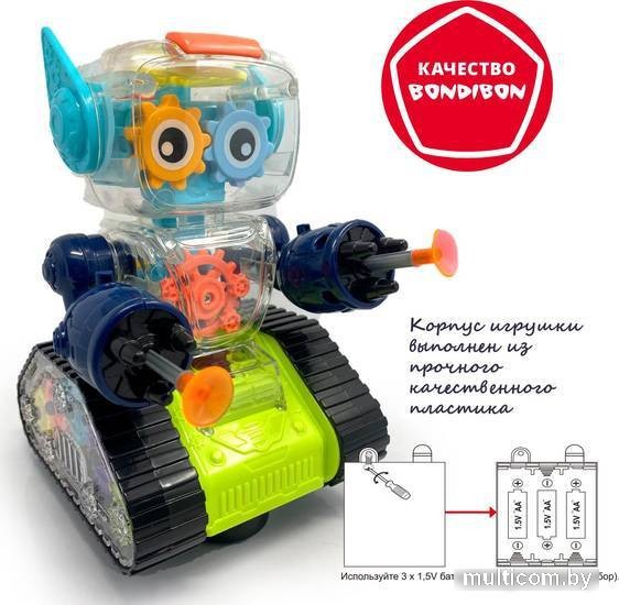 | Информация | Разноцветные шестерёнки весело крутятся в прозрачном корпусе робота! Прозрачный корпус игрушки позволяет ребёнку наблюдать, как работает механизм, как стыкуются между собой и вращаются яркие детали игрушки. Музыкальный РОБОТ С ШЕСТЕРЁНКАМИ от Bondibon способствует развитию интеллектуальных способностей малыша, помогает мелкой моторике, тренирует слуховое и зрительное восприятие. Игрушка вызывает положительные эмоции и длительный интерес к игре за счет разностороннего функционала и необычных элементов. Робот стреляет, объезжает препятствия. Рулевое управление вращается на 360 градусов. Игрушка светится разноцветными огоньками и создает праздничное настроение даже в темноте. Веселые мелодии очень нравятся детям. Звуковые и световые эффекты приведут малышей в восторг. |