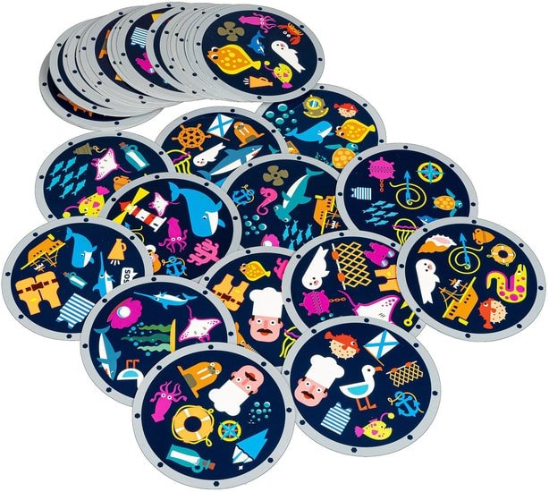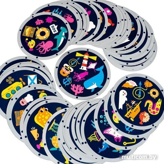 | Информация | Перед началом каждой игры внимательно рассмотрите все изображения на игровых карточках.Карточки круглые и имитируют иллюминатор. Весь подводный мир и всё, что связано с подводными путешествиями, отражено в изображениях на карточках. В дальнейшем будем называть их символами. Примеры символов вы найдёте в инструкции. На каждой карточке 8 символов, и есть ровно один совпадающий символ. Его и нужно найти. Ни одна из карточек не повторяется. |