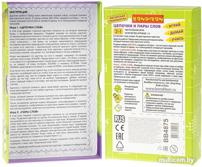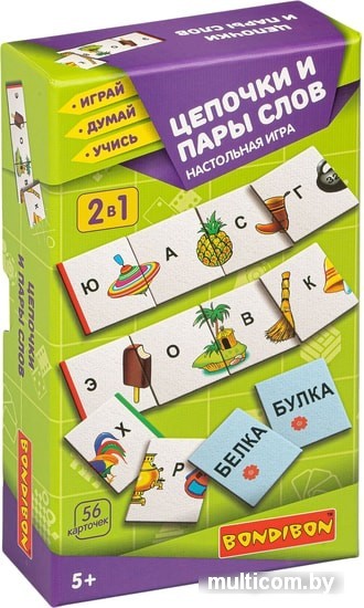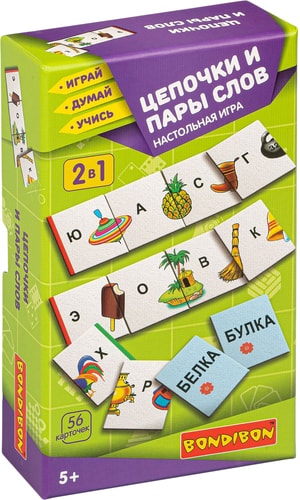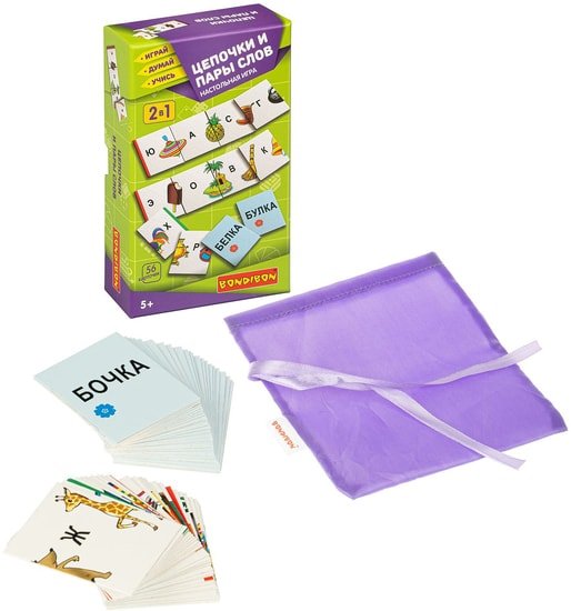 | Информация | Поможет детям научиться читать, способствует развитию мышления, коммуникативных навыков и весело провести время. Авторская разработка.В инструкции подробно описаны два варианта игры. «ЦЕПОЧКИ СЛОВ»: участники составляют цепочки из слов таким образом, чтобы следующее слово начиналось с буквы, на которую заканчивается предыдущее. «ПАРЫ СЛОВ»: на стол выкладываются карточки со словами из 3-х букв. Младший из игроков объясняет значение одного слова остальным игрокам. По этим объяснениям игроки ищут слово, которое отличается от загаданного одной буквой. Например: «Мягкий, усатый, мурлычет». Игроки угадывают слово «КОТ», затем подбирают к нему пару - «КИТ». Затем карточки со словами из 4-х букв и т. д. |