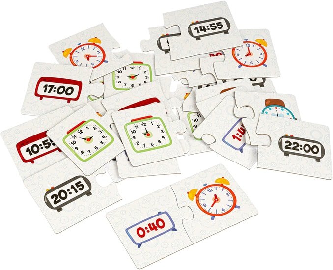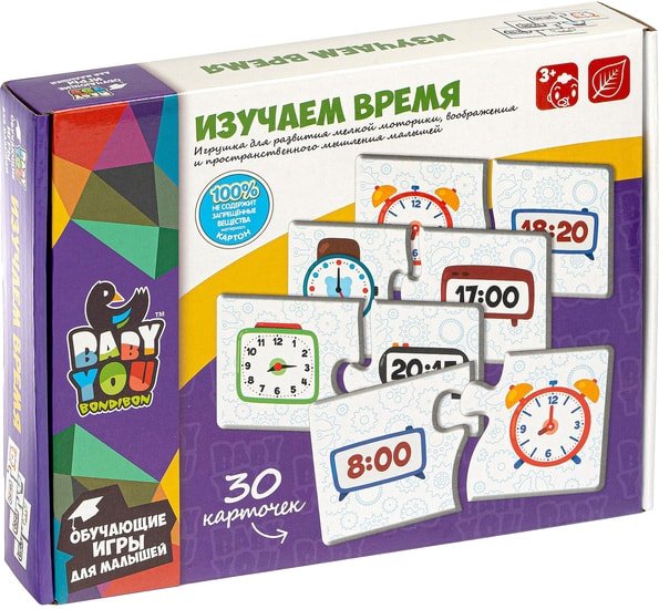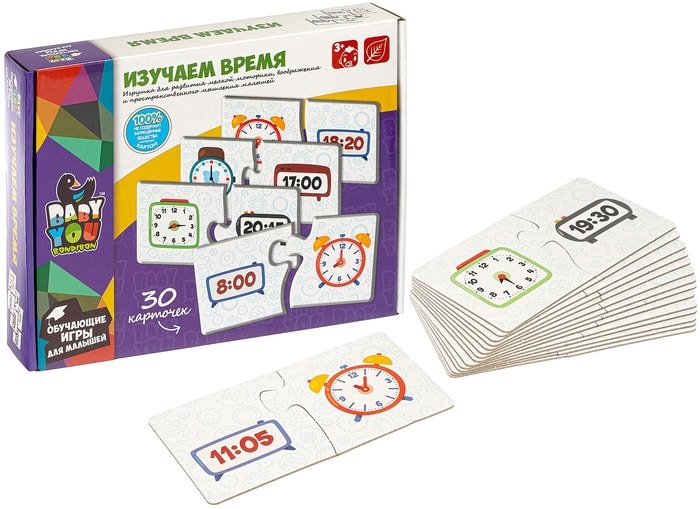 | Информация | Набор карточек-пазлов "Изучаем время" Baby You Bondibon предназначен для детей от 3-х лет и поможет в изучении времени. Состоит из двух половинок, одна из которых показывает цифры времени, другая - изображение времени на часах. Ребенку необходимо правильно подобрать соответствующие две половинки в 15 смысловых группах. Способствует в развитии логического мышления, внимания, речи, памяти, воображения, мелкой моторики, умения определять время. |