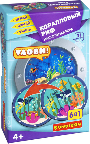 | Информация | Подводный мир в иллюминаторе! Весёлая настольная игра "КОРАЛЛОВЫЙ РИФ" из серии «УЛОВИ!» увлечет детей в подводное путешествие, а также поможет в развитии зрительной памяти, внимания и скорости реакции. 6 игр в 1! И все они рассчитаны на то, что участники играют одновременно, а выигрывает самый быстрый. Различные варианты игры Bondibon делают ее интересной для детей разного возраста! Перед каждой игрой следует внимательно рассмотреть карточки. На них изображены символы, связанные с подводным миром и путешествиями. Символы надо хорошо запомнить, потому что на карточках они будут прятаться за водорослями и кораллами. На каждой карточке 6 символов и есть только один символ, который может совпасть на другой карточке. Его и необходимо найти! |
