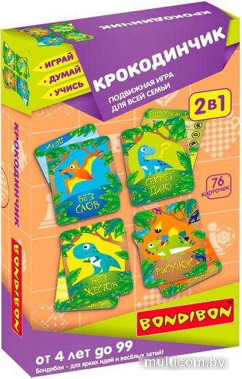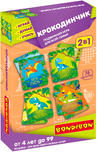 | Информация | Подвижная игра для всей семьи – как это здорово! Встречайте игру Bondibon «Крокодинчик» 2 в 1 и начинайте выполнять задания! В процессе веселой подвижной активной игры развиваются логическое мышление, внимание, наблюдательность и речевые навыки. По правилам Вы рисуете, показываете жестами или объясняете словами задание на игровой карте таким образом, чтобы другие игроки смогли угадать правильное слово. Так интересно, смогут ли Вас быстро понять. Есть еще бонус - специальные карточки СЕКРЕТ ДИНО, с помощью которых можно помочь товарищу по команде или сделать задание более сложным для соперника. |