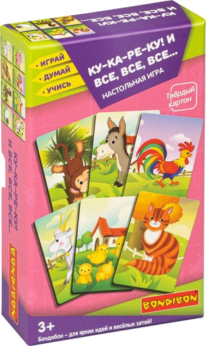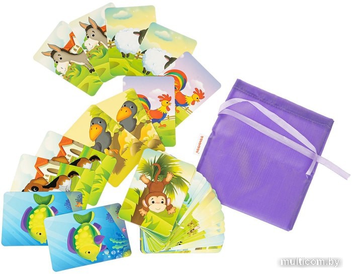 | Комплектация | 36 ярких, красочных карточек из твердого высококачественного картона с изображением 15 видов домашних и сельскохозяйственных животных, карты-джокеры с изображением рыбки и обезьяны, тканевый мешочек |