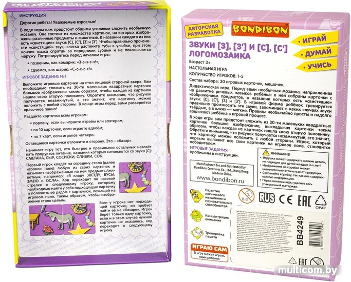| Информация | Как научить ребёнка выговаривать сложные буквы? Вам на помощь придет логопедическая игра «Логомозаика. [З], [З'] и [С], [С']» от Bondibon. Это необычная мозаика, где подобраны картинки, в названии которых есть «свистящие» звуки: [С], [С?], [З] и [З?].. В процессе веселой интересной игры, непохожей на скучные уроки, ребенок закрепляет правильное произношение этих сложных звуков в словах. Правила необычайно просты и увлекают ребёнка. Сложите из 30 маленьких квадратных карточек большое изображение так, чтобы каждая картинка нашла свою вторую половинку. При этом надо чётко называть изображение на карточке. Выигрывает тот, кто первым выложит все свои карточки на игровом поле! |