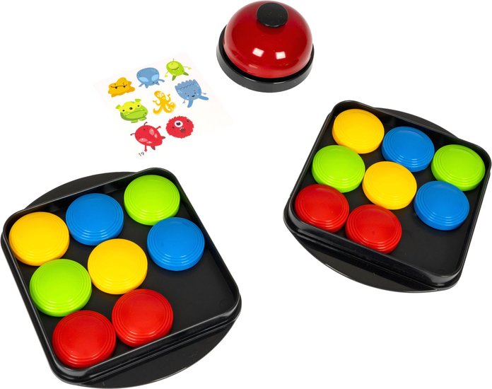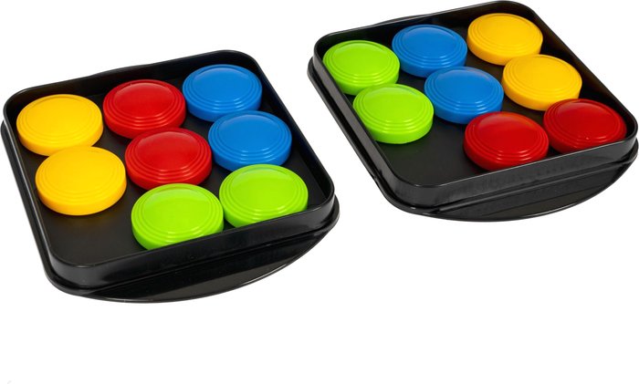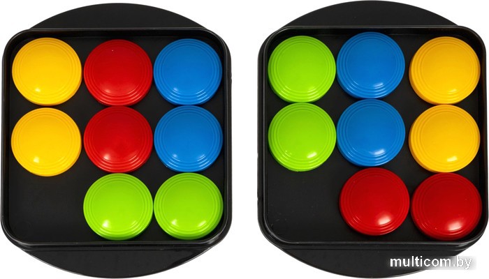 | Информация | Положите игровое поле перед каждым игроком. Вытащите из колоды карту, на которой изображена определенная цветовая комбинация. Как можно быстрее повторите расположение цветов, перемещая разноцветные шайбы на своем поле. Кто первым выполнил, нажимает звонок. Если задание выполнено правильно, игрок оставляет карточку-задание себе. В случае если задание выполнено неверно, карточка-задание кладется обратно в середину колоды. Вы победите, если соберете первым 5 карточек. |