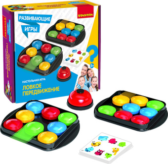 | Комплектация | 40 карточек, 2 игровых поля, 16 разноцветных фишек, звонок. |