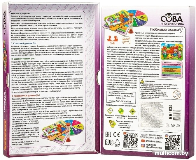 | Информация | Умная Сова Bondibon – лучший способ привить детям интерес к знаниям и расширить их кругозор. Данная игра разработана на базе авторской методики обучения, предполагающей новую форму подачи материала и способствующей усвоению новых для ребёнка знаний. Викторина включает самые разнообразные вопросы по мотивам сказок ""Репка"", ""Три поросенка"", ""Курочка-Ряба"" и ""Красная шапочка"", чтобы ответить на них - придется очень внимательно прочитать сказки! |