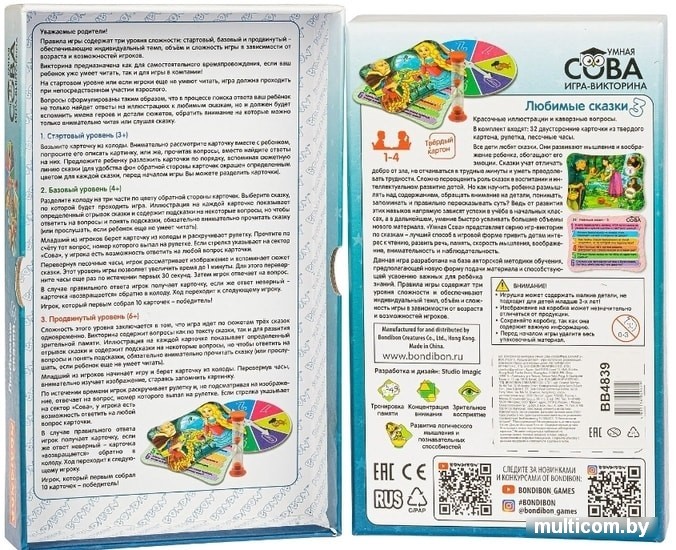 | Информация | "Игра-викторина ""ЛЮБИМЫЕ СКАЗКИ 3"" Умная Сова Bondibon – лучший способ привить детям интерес к знаниям и расширить их кругозор. Данная игра разработана на базе авторской методики обучения, предполагающей новую форму подачи материала и способствующей усвоению новых для ребёнка знаний. Викторина включает самые разнообразные вопросы по мотивам сказок ""Волк и лис"", ""Рапунцель"" и ""Белоснежка и 7 гномов"", чтобы ответить на них - придется очень внимательно прочитать сказки! |