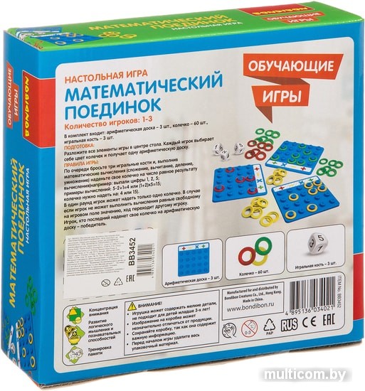 | Информация | В комплект входит арифметическая доска - 3 шт., колечко - 60 шт., игральная кость - 3 шт. ПОДГОТОВКА Разложите все элементы игры в центре стола. Каждый игрок выбирает себе цвет колечек и получает одну арифметическую доску. ПРАВИЛА ИГРЫПо очереди бросьте три игральные кости и, выполнив математические вычисления сложение, вычитание, деление, умножение наденьте свое колечко на число равное результату вычислениянапример выпали цифры 1,2, 5 примеры вычислений 5-214 или 12х515 колечко нужно надеть на 4 или 15. В один раунд игрок может надеть только одно колечко. В случае если игрок не может выполнить вычисления равные свободному на игровом поле значению, ход переходит другому игроку.Игрок, кто последний наденет свое колечко на арифметическую доску - победитель. |