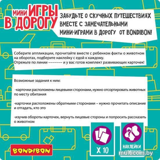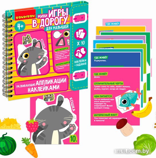 | Информация | Устройте мастер класс по аппликации для малышей! Развивающие аппликации от Bondibon – это отличный способ создать яркую картинку своими руками. Ведь очень важно развивать у малыша внимание, моторику, усидчивость и логику. В наборе 10 заготовок с забавными животными и комплект наклеек. Белочка, обезьянка, козлик, курочка, зайчик, коровка, слоник, мишка, собачка, кошка. Все зверушки потеряли свои ушки, носики, хвостики, глазки. Помогите им. Приклейте детали согласно образцу. Но набор не только творческий, но и познавательный! На обороте каждой аппликации есть факты о животном и задания. Аккуратно отрежьте по обозначенной линии, и Вы получите набор игровых карточек на сортировку, память, развитие речи. Красочные и компактные, они будут идеальными спутниками для маленького непоседы. Весь набор компактно упакован в мини-книгу с магнитной застежкой. |