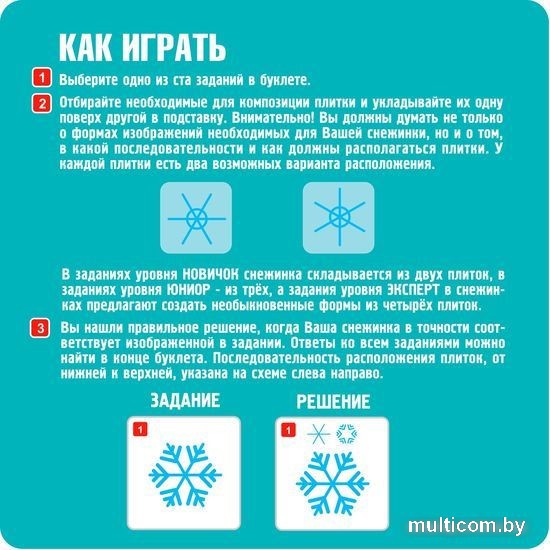 | Информация | За окном солнечно и идет снег? Попробуйте представить все многообразие снежинок, летящих с неба! Сказочные снежинки такие разные, одинаковых не найти! Попробуйте создать свои снежинки, складывая узоры на прозрачных плитках в игре головоломке "Мои снежинки. Кружево". Выберите одно из 100 заданий. Отберите нужные плитки и укладывайте их одну поверх другой в подставку. На начальных уровнях снежинка складывается из 2 плиток, но затем задания усложняются. И в заданиях уровня Эксперт уже необходимо создать необычные формы из 4 плиток. Логическая игра из серии «Бондилогика» способствует развитию логического мышления, познавательных способностей и концентрации внимания. В комплекте есть все, что нужно - 1 подставка, 16 прозрачных плиток с узорами, буклет с заданиями. Количество игроков: 1 Возраст: 4+ Все детали игры соответствуют высоким стандартам качества Bondibon! Прекрасный подарок для девочек и мальчиков! |