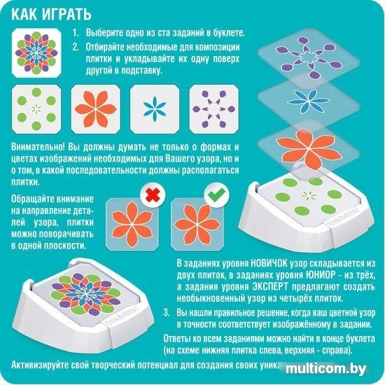 | Комплектация | В комплекте: 1 подставка, 16 прозрачных плиток с узорами, буклет с заданиями. |