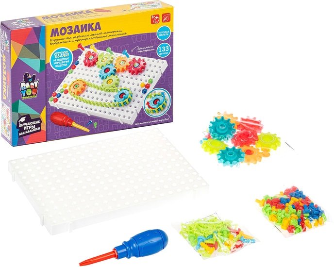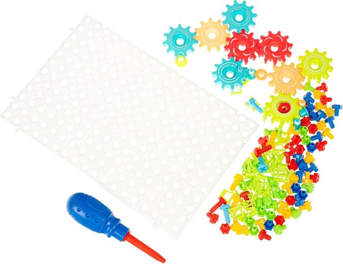 | Комплектация | игровая панель, элементы мозаики в виде винтиков и отвертка, шестерёнки и шестерёнчатый привод, предназначенные для сборки различных конструкций, всего 133 детали |