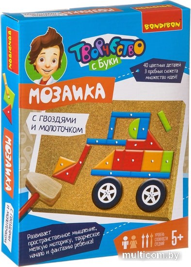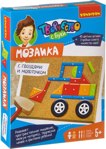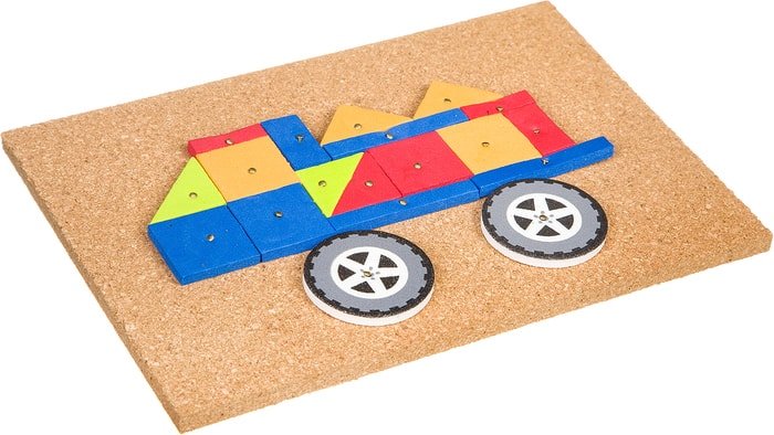 | Информация | Чтобы прикрепить деталь к основе, нужно аккуратно вставить в нее гвоздик и прибить его молоточком. Особых усилий не требуется, детали и пробковая основа мягкие, поэтому гвоздики легко входят в них. Также легко разобрать созданные картинки. Игра отлично тренирует мелкую моторику рук и глазомер ребенка, воображение и фантазию. |