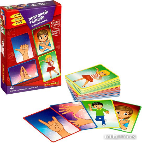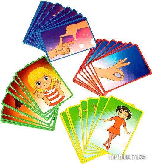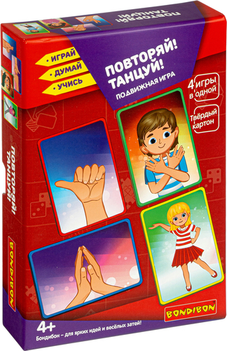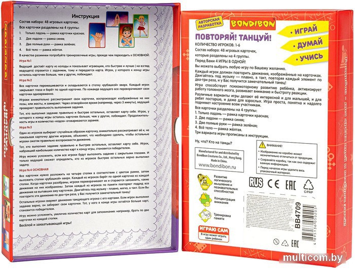 | Информация | Подвижная игра авторской разработки, включающая в себя различные варианты игры. Игра предназначена для детей от 4-х лет, но весёлый игровой процесс увлекает и ребят постарше, и даже взрослых. Количество игроков от 1-го до 6. 48 игровых карточек разделены на 4 группы: красная рамка карточки - это игра для одной ладони; синяя рамка - в игре участвуют две ладони; зелёная рамка - две полные руки; жёлтая - все тело игрока. В ходе игры каждый из игроков должен повторить движения, изображённые на карточках. Все повторения происходят в танце! Включите любимую музыку и двигайтесь в такт, повторяя каждый элемент по два-три раза, и наслаждайтесь весёлой вечеринкой! Тот из игроков, кто покажет себя лучшим на танцполе и соберёт наибольшее количество карточек, станет победителем. Правила подробно прописаны в инструкции. |