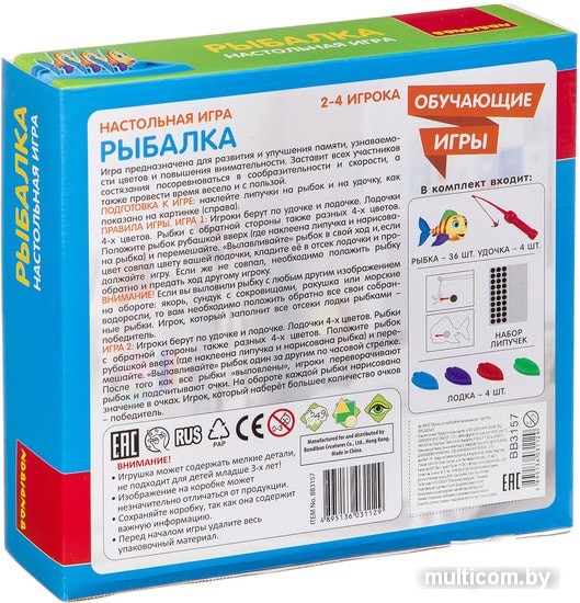 | Комплектация | рыбка - 36 шт., удочка - 4 шт., лодочка - 4 шт., набор липучек. |