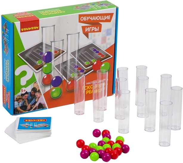 | Информация | Игра способствует развитию зрительно-моторной координации движения, памяти, концентрации внимания, зрительного восприятия, а также эмоционального развития. Заставит всех участников провести время весело и с пользой. ПРАВИЛА ИГРЫ Самый юный участник начинает игру. Он открывает карту из колоды. Игроки на скорость повторяют комбинацию, указанную на карте-задании, перекатывая шарики из одной колбы в другую. Тот, кто первый выполнит задание, должен крикнуть ЭКСПЕРИМЕНТ ЗАКОНЧЕНУчастники проверяют совпадение комбинации, указанной на карте-задании, и получившегося экспериментального результата, и, если задание выполнено правильно, игрок забирает карту себе. Игрок, собравший наибольшее количество карт, становится победителем. |