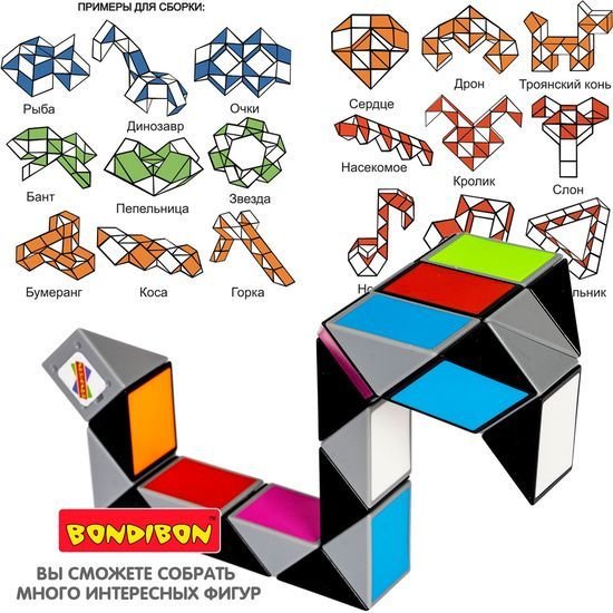 | Информация | Полезная головоломка для детей и взрослых! ЗМЕЙКА, ставшая хитом еще в прошлом веке, пользуется неизменной популярностью в наши дни. Игрушка отлично тренирует логику, терпение, мелкую моторику и навыки пространственного мышления. Похоже на кубик рубик, но больше задействуются работа с формами, чем с цветами. Разноцветная головоломка от Bondibon состоит из 24 равнобедренных треугольных призм, соединенных между собой шарнирами. Из нее можно конструировать различные фигурки. В набор вложена инструкция по сборке 18 фигур! Не думали, что такое возможно?!)) Попробуйте сложить разные формы. Приятное и полезное времяпровождение в дороге, в очереди, на досуге. Набор Smart Призмы от Bondibon - отличный подарок для детей от 4 лет, даже подросткам и взрослым будет интересно и полезно! |