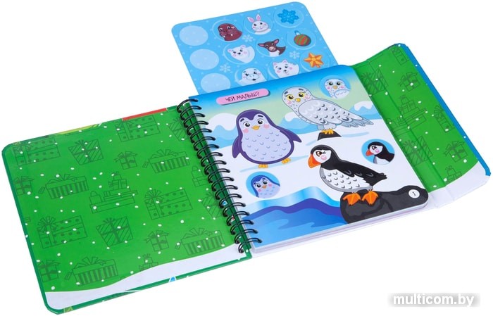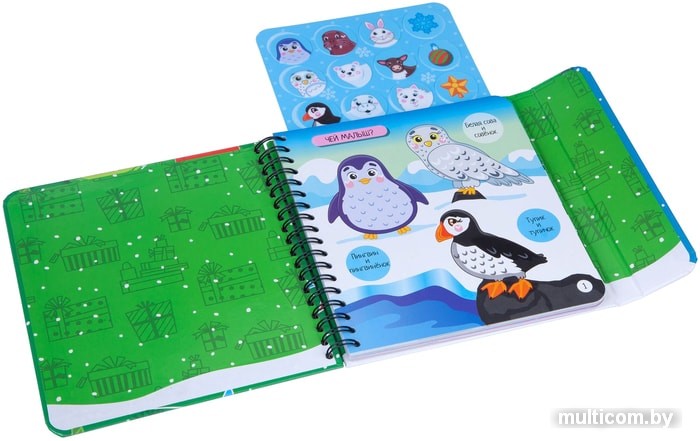 | Комплектация | 12 фишек-стикеров с изображением детёнышей разных животных, ёлочных украшений и снежинки, а также 30 разнообразных заданий |