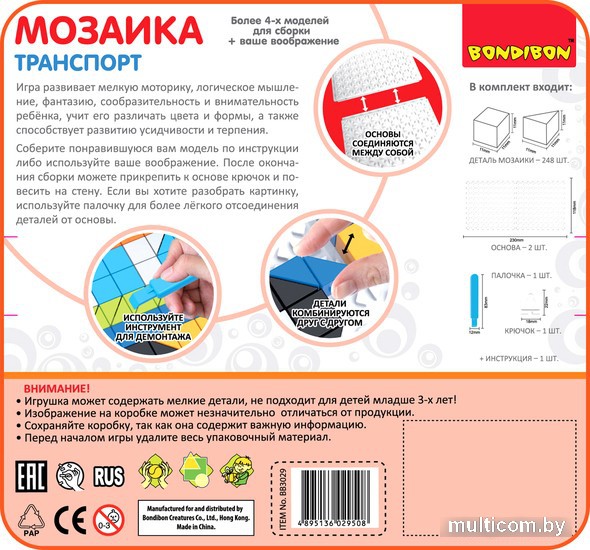 | Информация | Игрушка 3 в 1 - мозаика, картинка на стену и пазл в одном! Соберите понравившуюся вам модель по инструкции либо придумайте свою! Соберите понравившуюся вам модель по инструкции либо придумайте свою! После окончания сборки можно прикрепить к основе крючок и повесить свое творение на стену. При необходимости разобрать картинку используется палочка для более легкого отсоединения деталей от основы. Игра развивает мелкую моторику, логическое мышление, фантазию, сообразительность и внимательность ребенка, учит его различать цвета и формы, а также способствует развитию усидчивости и терпения. |