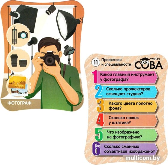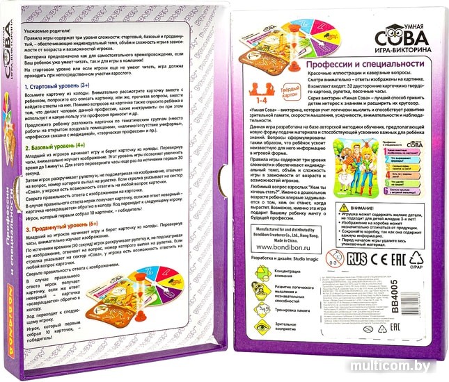 | Информация | Игра-викторина Умная Сова Профессии и специальности развивает внимательность и память! Викторина предназначена как для самостоятельного времяпровождения, так и для игры в компании! Содержит красочные иллюстрации и каверзные вопросы. Вопросы сформулированы таким образом, что уже при их прочтении у вашего малыша будут закладываться новые знания. Данная игра разработана на базе авторской методики обучения, предполагающей новую форму подачи материала и способствующей усвоению нового для ребёнка материала в игровой форме. Правила игры содержат три уровня сложности и обеспечивают индивидуальный темп, объём и сложность игры в зависимости от возраста и возможностей игроков. Таким образом, игра подходит для детей от 3 до 6 лет. Подробные правила игры указаны на внутренней стороне упаковки. Любимый вопрос взрослых Кем ты хочешь стать?. Именно в дошкольном возрасте ребенок впервые задумывается о том, кем он станет, когда вырастет. Возможно, именно эта игра подарит Вашему ребенку мечту о будущей профессии. |