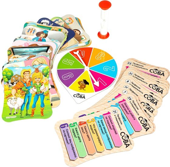 | Комплектация | В комплект входят 32 ярких картинки с шестью вопросами на каждой из них, рулетка, песочные часы. |