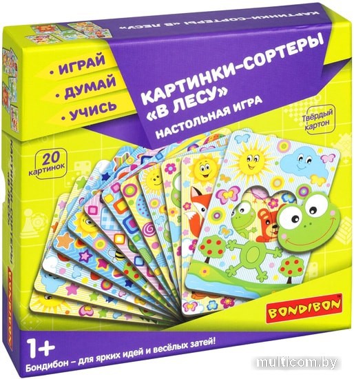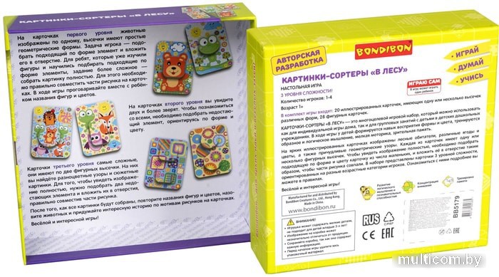 | Информация | Настольная игра картинки-сортеры "В ЛЕСУ" 3 в 1 Bondibon – это отличное начало образовательного процесса малыша. Серия Играй думай учись разработана профессионалами в области психологии и педагогики и направлена на развитие когнитивных навыков ребенка. В игре 3 уровня сложности, что позволяет поэтапно стимулировать концентрацию внимания, логику и мелкую моторику. В карточках есть отверстия, для которых нужно подобрать недостающую часть, совпадающую по цвету, форме и рисунку. Не забывайте рассказывать ребенку о зверятах, растениях и фигурах, которые изображены. Придумайте интересную историю, связанную с тем, что ребенок видит на карточке – вовлекайте его в игровой процесс и обучайте новому. В комплекте: 20 иллюстрированных карточек с высечками различных форм и 28 фигурных карточек. Количество игроков от 1-го до 4-х возрастом 1+. Подарите малышу настольную игру картинки-сортеры "В ЛЕСУ" 3 в 1 Bondibon и легко развивайтесь в игровой форме. |