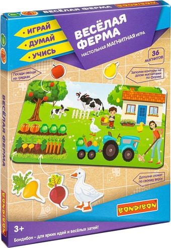 | Информация | Настольная игра Веселая ферма - это магнитная игра для детей от 3 лет, позволяющая в игровой форме изучать животных и растения фермы. Магниты можно распределить на игровом поле в обозначенные контурами места и дополнить картину другими элементами по своему вкусу. Игра развивает воображение, память, мышление, моторику и пространственную ориентацию. |