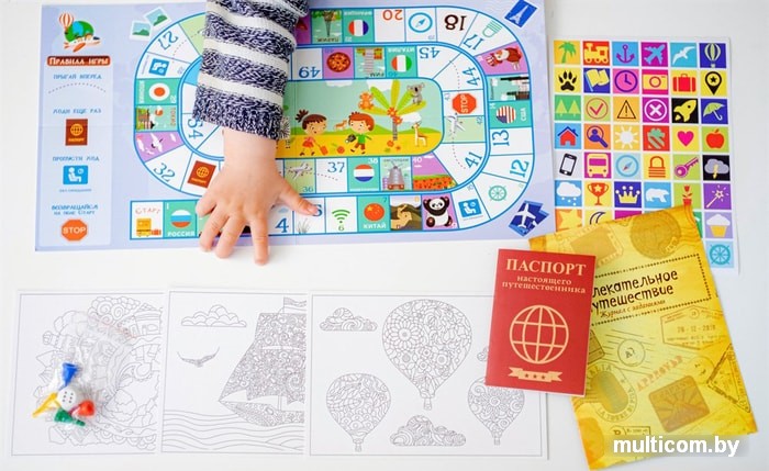 | Комплектация | настольная игра-ходилка, фишки и кубик для игры, паспорт путешественника, книжка-инструкция с заданиями, наклейки, открытки-раскраски 3 шт. |
